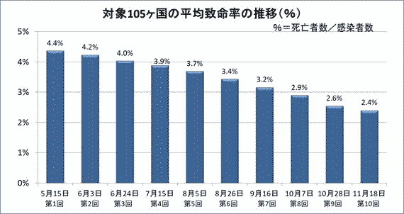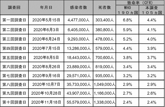 本調査の目的は世界各国。地域、経済グループ等を対象に、致命率(CFR:死亡者数/感染者数)を