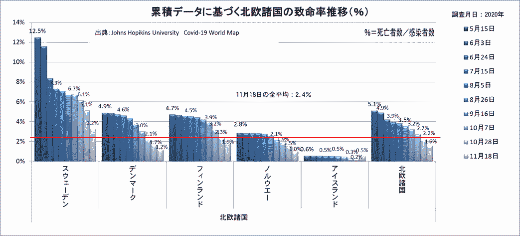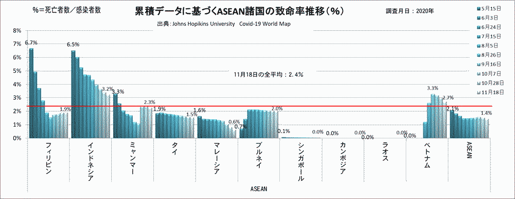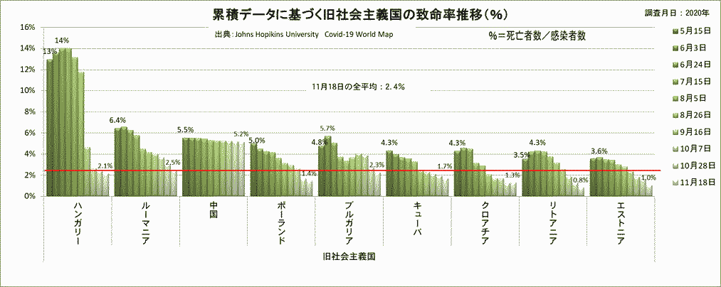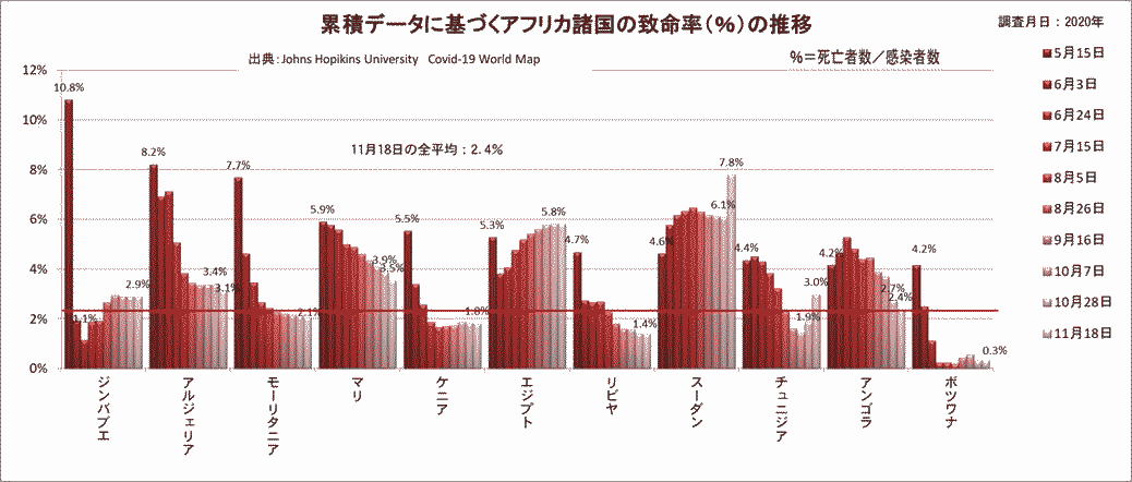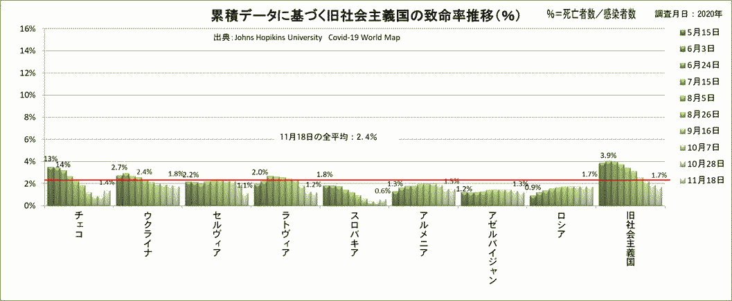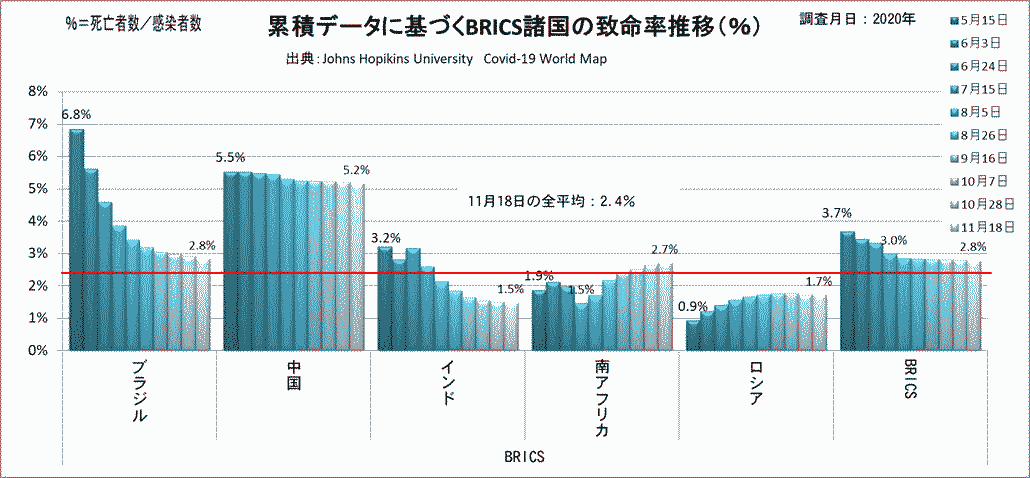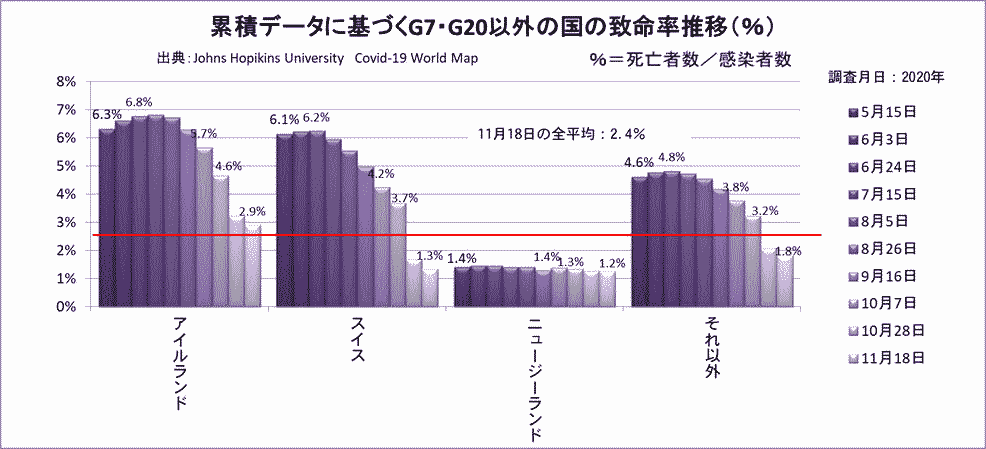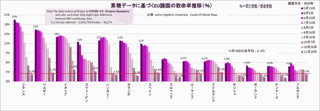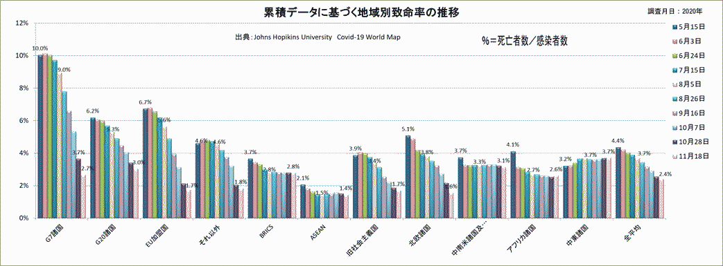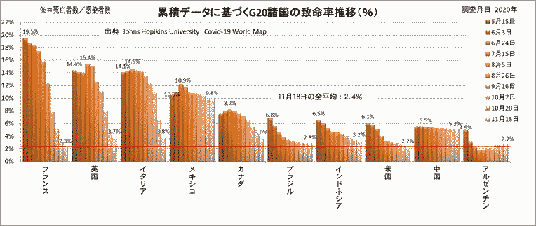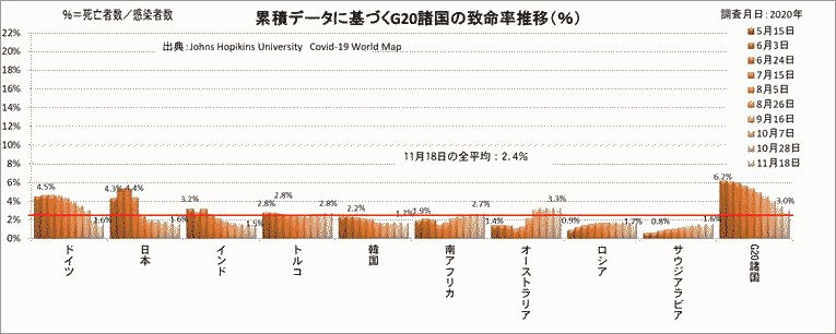 以下は感染者数と死亡者数に基づくCFRの推移である(数字は各調査日11月20日のグラフ