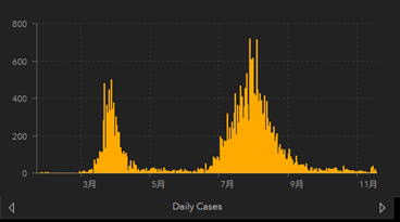 第1波のピークは7月中旬で一日140人程度の感染が見られたが、その後低下し、11月に