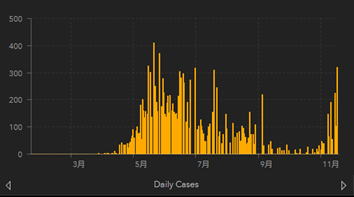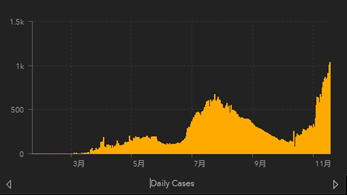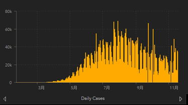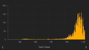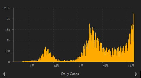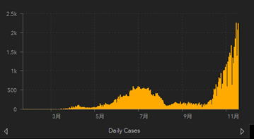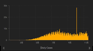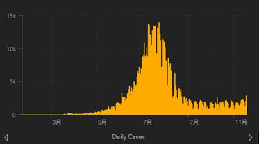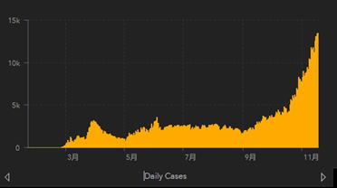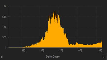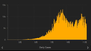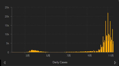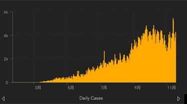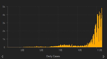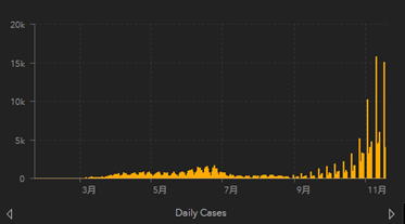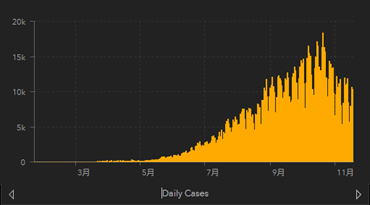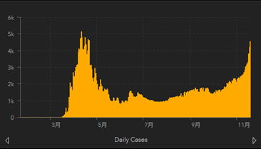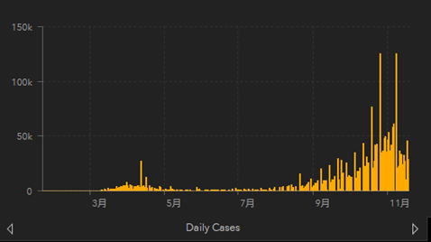 北半球の先進国、人口集中エリアが冬に向かい再び感染が拡大している傾向が見て取れる。