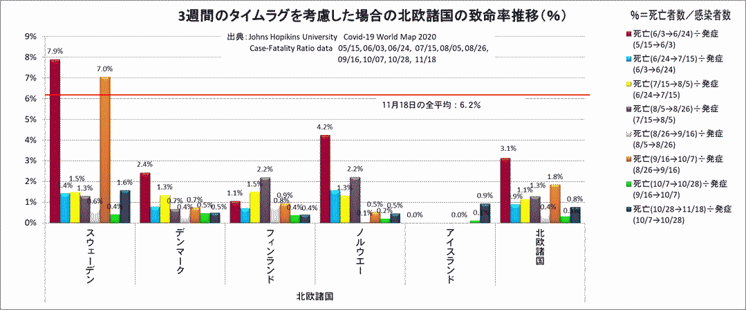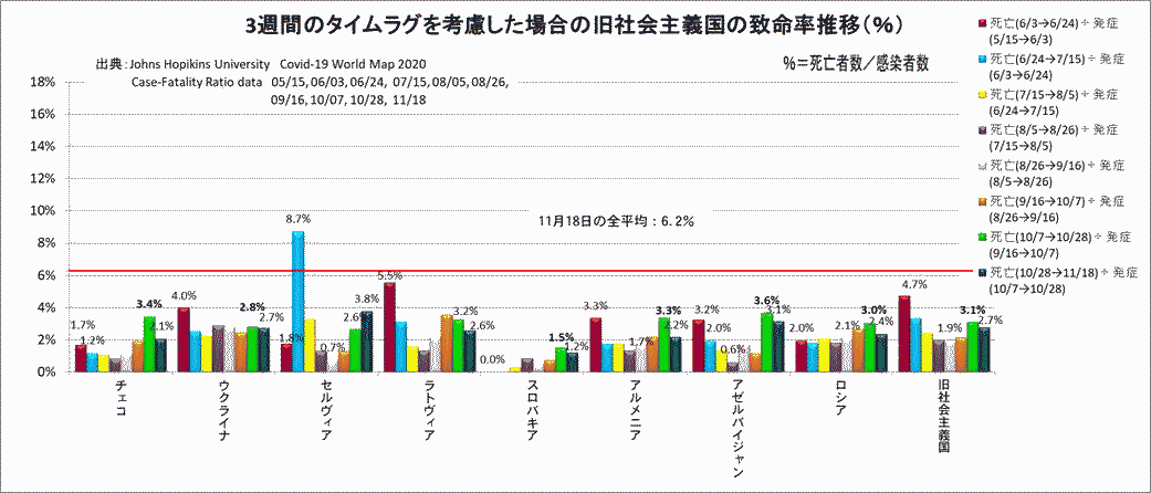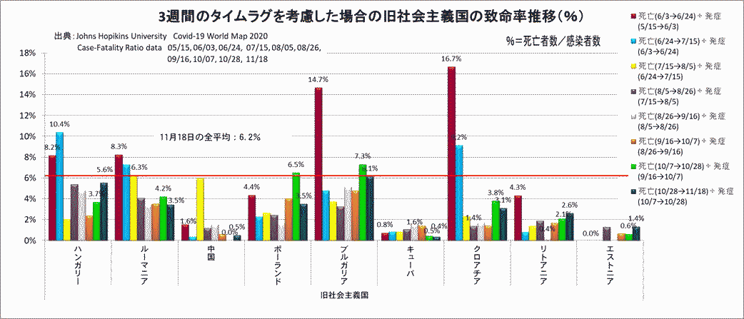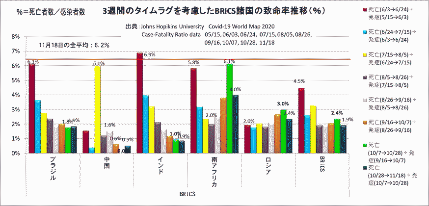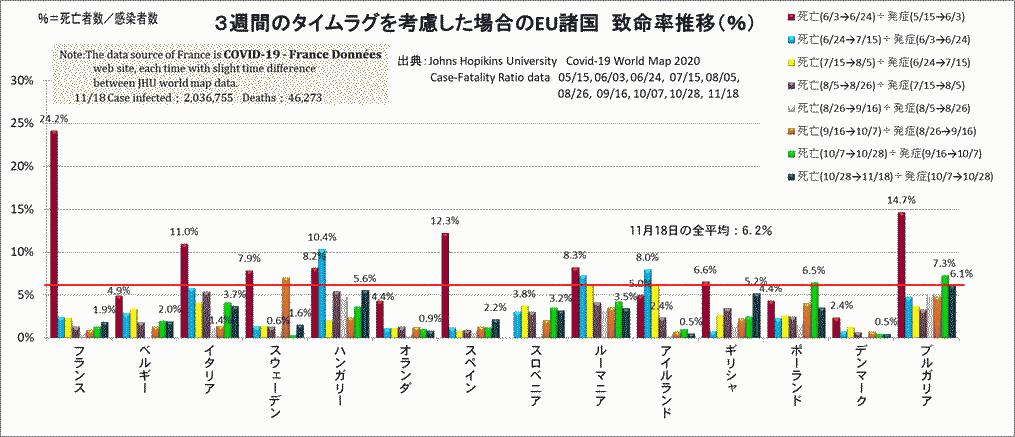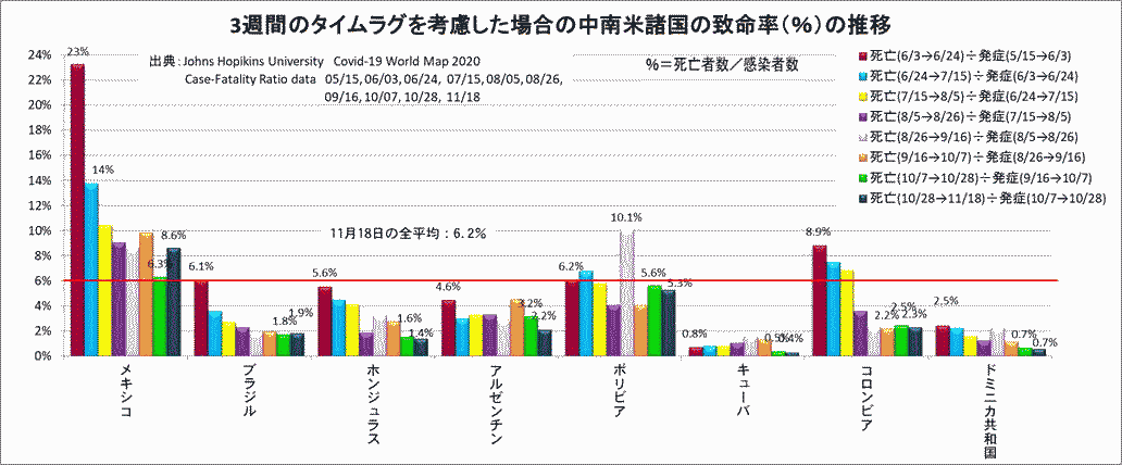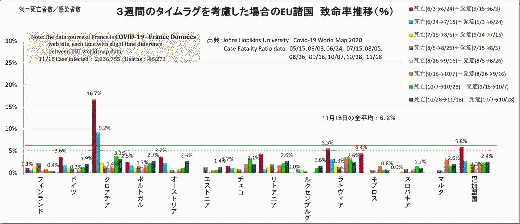 ラグを考慮した平均値を示した。11月18日の累積のCFR平均値は2.4%と微減、タイムラグを考