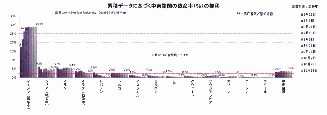 ・中東諸国の累積データに基づくCFRの平均は5月から11月の6ヶ月間で、3.2%から3.7%へと