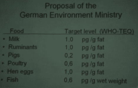 ドイツ環境省の基調講演では、ドイツ政府が乳製品に関し2002年7月のEUの食品中ダイオキシン基準の最大許容値の3倍、行動指針値の2倍も厳しい新指針を適用することが示され。