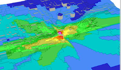 | 図2 厚木基地3次元流体シミュレーションによる産廃焼却炉周辺の年平均ダイオキシン濃度の推定(3次元) |