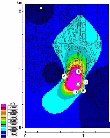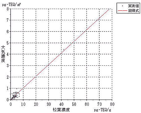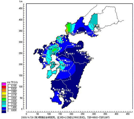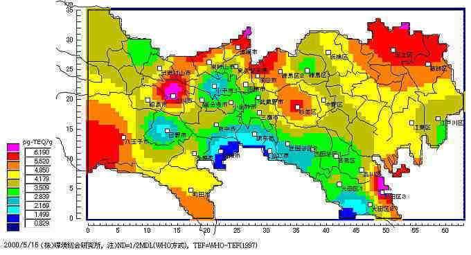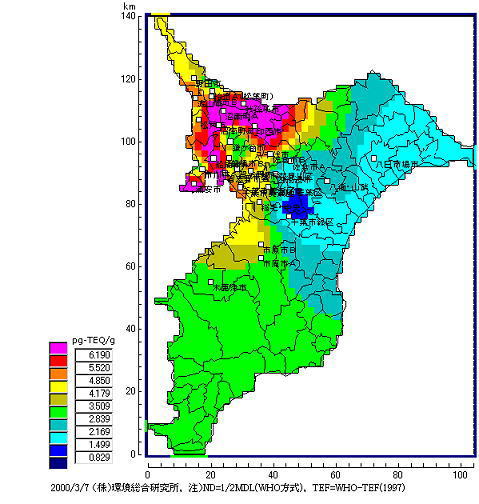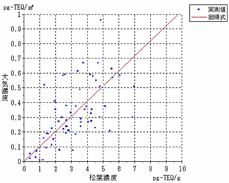 結果は、表7−1に示すように、焼却炉の風下の松葉からは夏場で53.0pg-TEQ/g、冬場で30.6pg-TEQ/gという高濃度のダイオキシン類が検出された。表からは松葉の濃度は発生源からの距離だけでなく風向、風速などの気象条件や地形条件によって大きな影響を受けることが分かった。
