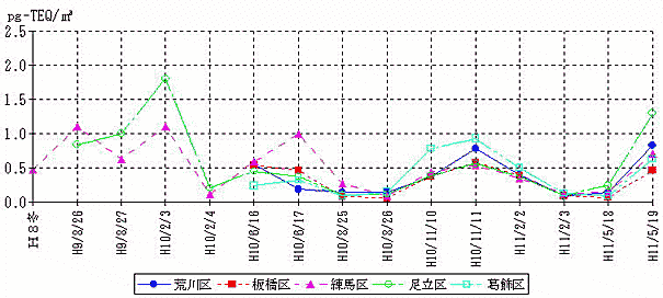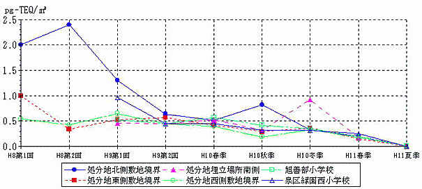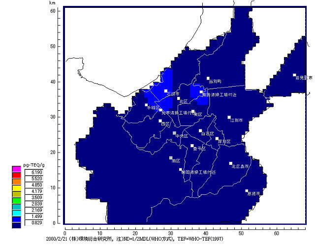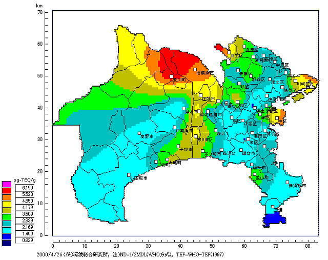 さらに、平成11年27日から平成12年2月21日にかけ連続56日間の日米共同モニタリング調査が行われた。調査地点は、北風系が卓越することから基地外の綾瀬市深谷地区の3地点である。実際の測定分析は環境庁と神奈川県が共同で行っているが、夏場の日米共同モニタリング調査と分析会社は別となっている。なお、サンプリングスパイクの適用の有無は現在のところ不明である。表6−3に結果を示す。北風系と言うこともあり、基地の南側の綾瀬市深谷地区の工業団地で21pg-TEQ/m3、平均でも1.4pg-TEQ/m3の高濃度が検出されている。
