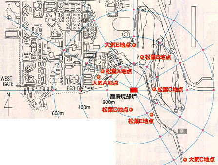 平成11年12月9日、環境総研は米政府からあらかじめ許可を得、神奈川県大和市、綾瀬市にまたがる厚木基地内で松葉の現地試料採取を行った。松葉試料の採取場所は、図7−1にあるように、国内最高値58pg-TEQ/m3を記録した大気B地点の南東側の松葉B地点、高層住宅棟近傍の大気A地点の北東の松葉A地点、大気C地点の北側で産廃焼却施設脇の松葉C地点、さらに背景濃度測定用として産廃施設から1.6km北北西に離れた地点の4ヶ所を、さらに基地内とは別に焼却炉から170〜200m離れた綾瀬市深谷地区の2ヶ所(松葉D地点、松葉E地点)でも行った。いずれも地上約1.5m高のクロマツの針葉を採取の対象とした。採取の当日は冬だというのに強い南風が吹いており、夏の日米共同調査とほぼ同じ気象状況となっていた。厚木基地側の米海軍住宅地も高濃度のダイオキシンを含む煙につつまれており、屋外で遊び場の利用など外出が制限されていた。