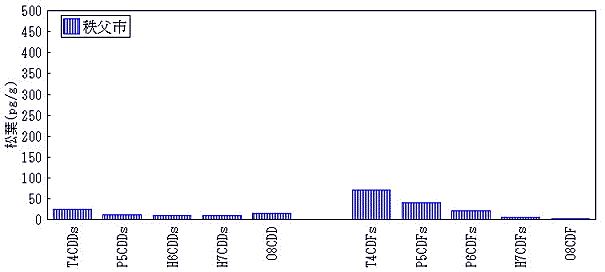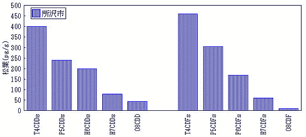 図3−2は、環境庁が平成9年度の総合パイロット調査で行った埼玉県内の松葉調査の一部である。同族体パターン及び実測濃度はははっきりとした違いを示している。毒性等量濃度は、発生源の集中している狭山市赤坂付近が24pg-TEQ/g、発生源の少ない未汚染地域である秩父が2.3pg-TEQ/gである。ちなみに、土壌中DXN濃度は所沢周辺地域の狭山市赤坂が94.5pg-TEQ/g、秩父が7.5pg-TEQ/gであった。この結果は、クロマツが的確に一般環境大気中のDXN汚染を反映することを示している。