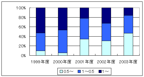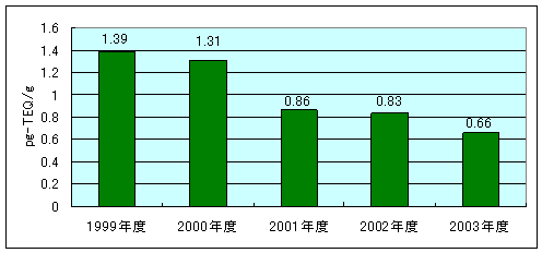 図2に99年度から03年度までの5年間の濃度域の変化を示しました。それによると、2000年度までは、1pg-TEQ/gを超える地域が50〜40%を占めていましたが、2001年度以降は、0.5pg-TEQ/g以下の地域が次第に増加し、2003年度は99年度と逆転し40%を上回っています。