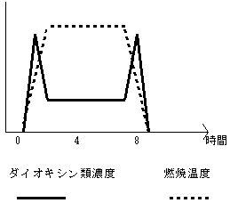したがって、@どの時点で、A何時間単位で排ガスをサンプリングするか、は排ガス濃度の測定上極めて重要な要素となる。焼却炉、とくにバッチ炉や准連続炉における排ガス中のダイオキシン類の濃度は、図2−1に示すように、たち上げ及び立ち下げ時に高くなる。これはたち上げ、立ち下げ時に、燃焼温度が下がること不完全燃焼となることなどに原因がある。