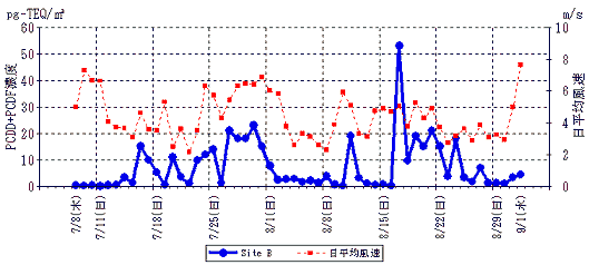日米共同モニタリング調査では「サプリング・スパイク」が本格的に適用されている。結果は平成11年10月25日環境庁より速報された。表3−1は連続測定した大気濃度の地点別最高値、最小値、平均値であり、図3−3は、産廃焼却炉に最も近いB地点における56日間の環境大気中のダイオキシン類濃度である。