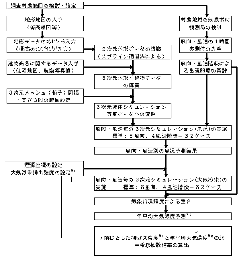 地形・建築物・構造物を考慮した3次元流体大気拡散シミュレーションモデルを用いた調査の手順を図5−1に示す。