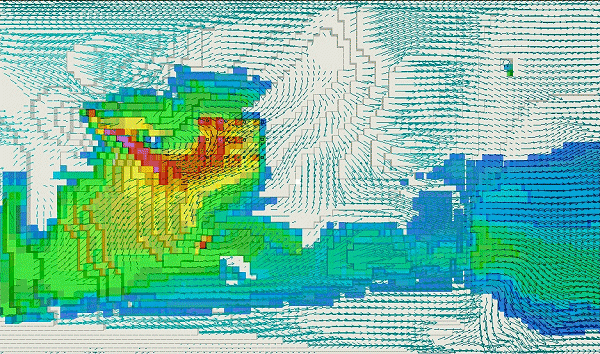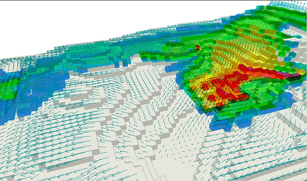 図6 処分場から飛散するダイオキシンのシミュレーション結果(風の流れ) ![]() |