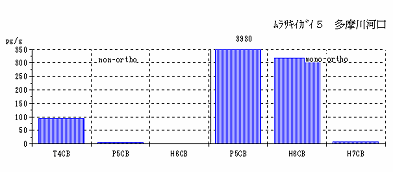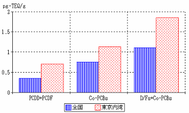 この結果を、先に示した環境庁の全国一斉調査と比較すると、DXN類(PCDD+PCDF)は、全国15サンプルの2倍、コプラナーPCB類は1.5倍となっており、東京内湾の汚染が著しいことが伺える。