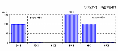 一方、コプラナーPCB類の異性体分布を見ると、mono-ortho(モノ−オルソ)の5塩化物が非常に高くみられ、その次にnon-ortho(ノン−オルソ)の4塩化物と、mono-ortho の6塩化物がほぼ同量ずつ蓄積されている。mono-orthoの5塩化物は、non-orthoの4塩化物とmono-orthoの6塩化物の20倍近くも多い。
