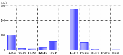 0.58pg-TEQ/g(ND=O)、コプラナーPCB類が平均1.1pg-TEQ/gとなっている。