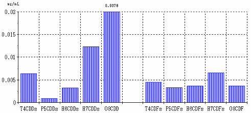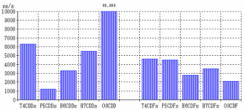 また、DXN類の同族体パターンを見ると、以下に示すように、採取地による若干の違いはあるものの、いずれも、4塩素化体が高く7、8塩素化体は低い濃度となっていることがわかる。これは、宮田教授が大阪湾北港で採取し分析された結果と同様のパターンとなっている。