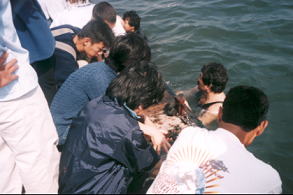 ■ほろ苦い冗談ウェットスーツに身を包んだ二人が、藤沢市引地川の河口で堤防に張り付いた。海を愛するサーファーたちの全国組織「サーフライダー・ファウンデーション・ジャパン(SFJ)」事務局長の上田真寿夫さん(三八)と「海と自然と砂浜を守る会」の塩阪源一郎さん(三七)。サーフィンを楽しむ若者たちを背に、ムラサキイガイの採取に追われた。 貝は堤防にガッチリくっついている。金属製のヘラではがそうとする間に、何度も波が打ちつけた。しぶきをかぶった塩坂さんは「あーダイオキシンの海だ」と冗談めかす。サーフィン、観光で多くの人の訪れを待つ地元住民としてはほろ苦い冗談だ。 作業を見守り、陸部で貝を受ける環境総合研究所の青山貞一所長(五三)、提案者の同研究所、池田こみちさん(五一)、地元サーファーら約十人に交じり、「伝説のサーファー」日本サーフィン連盟相談役坂田道さん(六三)の姿もあった。 坂田さんが「海の環境問題だ。お手伝いしたい。」と話すと、上田さんがこう補足した。「自分たちが入り、飲むことだってある海のこと。汚染には関心が高い。サーファーが水質を調査するのは、世界の潮流だ」 |