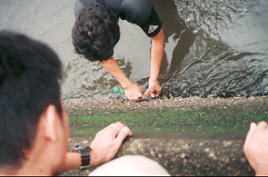 | 試料採取の様子 (上は新聞掲載写真ではなく 環境総合研究所撮影) |