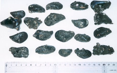 | 採取したムラサキイガイ (上は新聞掲載写真ではなく環境総合研究所撮影) |