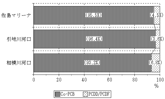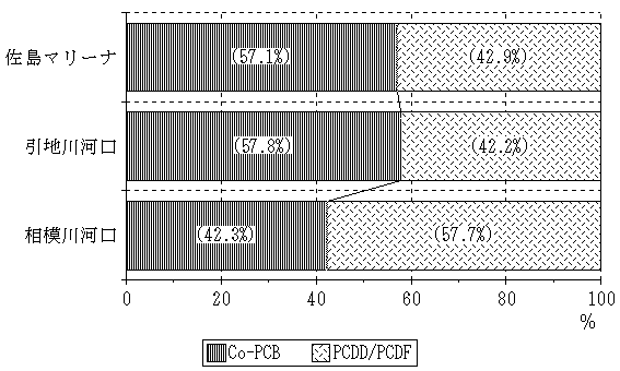 ダイオキシン類についても同様に3地域の同族体パターンの比較を行った。その結果、3地点とも極めて類似した同族体パターンとなった。しかし、4塩化及び5塩化ダイオキシンと同フランの構成につてみると、表2−3に示したように、毒性等量濃度の低かった佐島マリーナと他の2地点は明らかに異なった構成となっていることが分かる。これは、引地川河口と相模川河口のムラサキイガイのダイオキシン類の由来が類似していることを示唆している。