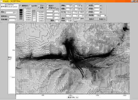 シミュレーションでは東西方向2100m、南北方向1300mの範囲の地形、建物を考慮し、予測結果の表示も同じ範囲について行う。ただし計算を行う際には、風上・風下方向に空間を大きく取る必要があるので、計算空間としては約4000m×3000m以上の範囲を対象としている。高さ方向は対象範囲内の最も低い地表面から上空約4000mを計算範囲とした。住宅地図2)、道路の計画図1)等を用いて、高尾山等の起伏、建築物、構造物の位置をコンピュータに入力し、さらに建築物、構造物の高さを個別に設定した。(図4−2)水平方向のメッシュ規模は、東西方向、南北方向ともに評価対象地域中心部においては5〜10mとし、周辺部では20〜30m、評価対象範囲外では100m程度以上とした。高さ方向のメッシュ規模は地表付近から高架道路以上までを5mと詳細に設定し、上空に上がるに従って10m以上と大きくして、計算範囲の一番上の部分では100m程度以上とした。