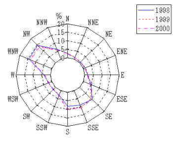 対象地域に最も近い八王子市館町測定室(一般環境大気測定室)における1998年1月〜2000年12月の風配図3)を図2−3に示す。年間を通じて西北西〜北西の風の出現頻度が高く、次いで南〜南東の風の出現頻度が高い。