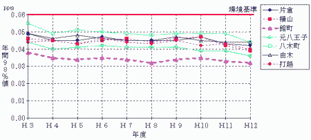 八王子市内のNO2濃度の経年変化を図2−4に示す。予定地に最も近い館町測定室(一般環境)の年平均濃度は0.015ppmを上回る程度である。中央自動車道に近い元八王子測定室(一般環境)では0.02〜0.025ppmと環境基準は下回っているものの比較的高い濃度となっている。