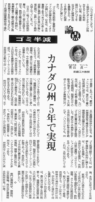 ![]() 日本のダイオキシン汚染状況を報じるジャパンタイムス青山貞一インタビュー記事 ![]() 環境行政改革フォーラム愛知大学大会一般発表の記事(中日新聞) ■20カ国以上に及ぶ徹底した海外現地調査 ERIの大きな特徴は、海外の研究機関、政府機関、自治体、NPO、それと在日大使館とのつながりだ。 ●カナダ・ノバスコシア州・ハリファックス市(Nova Scotia in Canada) 当然、それらのつながりは一朝一夕にできない。たとえば、カナダのノバスコシア州政府や現地のNPOとの関係ひとつをとってみても、東京から10000km以上から離れたハリファックスまで、青山、池田は今までに5回も往復している。 最初に行ったとき、現地はマイナス20度C、現地の新聞社が私たちに取材にきた。何でこんな遠く、寒いところにわざわざ日本から来たのか? と。当然の質問である。 ※ハリファックス・トリビューン紙の私たちへのインタビュー記事 私たちは「ノバスコシア州、ハリファックス市はゴミ問題、循環型経済型社会づくりで世界のトップランナー。それを見ない手はない」とインタビューに応えた。 それ以来、ERIは30名、20名規模の現地視察団を引率し、現地に行った。斎藤さんはこのとき衆議院議員の秘書として現地視察に参加したひとりである。 2005年には青山が教授をしている武蔵工業大学環境情報学部の準正課授業(海外研修)として学生、大学院生、留学生もNPOらと一緒に現地体験するに至った。 さらに、2006年9月は現地から2名をお呼びし、全国縦断環境政策講演会を函館から福岡まで7カ所で開催した。 ERIは、「こだわる」ことでは人後に落ちない。相手先もおどくくらいだが、そのくらいでないと本当のことは分からない。コミュニケーションも取れないと思っている。 23年前、カナダから来た若い都市計画の研究者をカナダ大使館が私たちに紹介、それ以来はじまったカナダとのつきあいはカナダ各地の研究者、政策マンらと未だにつづいている。在日カナダ大使館も超ミニシンクタンク、ERIにさまざまな便宜を図ってくれている。 by T.Aoyama and K.Ikeda at East Coast Environmental Conference in Halifax, Nova Scotia