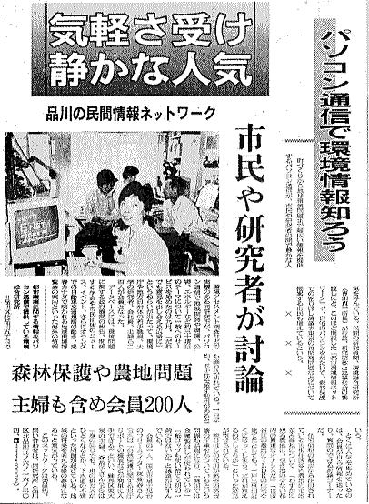 ■株式会社でNGO ERIの組織・経営上の大きな特徴は、「株式会社でNGO」を行っていることだ。 独自の技術と経験それにノウハウを駆使し、財政的基盤をつくる。 その上で第三者的なNGO活動を強力に推進する。財政的、経済的基盤がなければ言いたいことは言えない。独立など保てない、が青山の口癖である。 これがERI流であり世界でもほとんど例がない。NGOであることが重要であり、NPO(非営利組織)にこだわらない。そしてナンバーワンよりオンリーワンを地でいっている。 ■全国初の民間環境情報ネットワークを構築 ERIは、インターネットが使われるようになるはるか前から全二重のパソコン通信を使ってE−NET(EはEnvironment、環境のE)と言う名前の環境情報ネットワークを全国規模で設置、運用してきた。事務局は池田こみちが担当した。 E−NETには国内だけでなく、海外にいる日本人はじめ多くの多様な人々が参加、湾岸戦争のときには重要な情報源、データ通信メディアとなった。 またE−NETがきっかけとなり、その主要メンバーによって環境行政改革フォーラムと言う全国規模の環境行政改革のNPOができた。 ![]() 日本で最初の環境問題専門のパソコンネット(E-net)開設(朝日新聞1989)