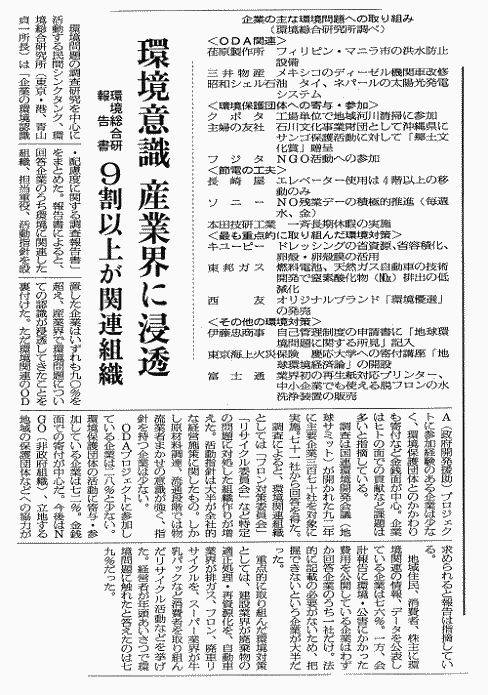 本ファイルは、著作権、制作権との関係であくまでも個人的視聴以外は使えません。 ![]() 湾岸戦争の環境影響調査報告書をまとめた。「ひと」朝日新聞 ![]() 自動車排ガスによる地球温暖化問題(毎日新聞) ![]() 上場企業の環境認識・環境配慮度調査(日経産業新聞1994年4月10日)