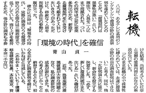 | 本稿は、日本環境法律家連盟 JELF、「環境と正義」、1998年5月号掲載内容を2004年1月、2006年11月に大幅拡充し、写真、画像、動画、新聞記事を加えたものです。転載禁 株式会社環境総合研究所(Emvironmental Research Institute, Inc.略称、ERI)は、1986年創立、2006年(平成18年)で創立20周年を迎えた。 ■環境シンクタンク一筋 ERIは、環境科学、環境政策、環境法の専門家、研究者によるシンクタンクである。 同時に、専門家によるシステムハウスである。さらにはNGO(非政府組織)でもある。ERIの卒業者を含めると数学、化学、物理、海洋などの理学、流体力学、応用物理、応用化学、情報システム、情報メディア、通信工学など工学、政治、経済など社会科学など多岐にわたり分野も広い。 個別学問の専門性に固執したり、再度、「象牙の塔」化している大学組織などにいる研究者や専門家から見ると、奇異に感じるかも知れない。 しかし、ERIにあつまる者は、奇異に感じるどころか、個別細分化された専門領域からのアプローチでは現代の環境問題のような総合的、学際的問題は解決できないと考える。 ERIの研究員は実務的な能力を重視する。現場思考(志向)が強い。 所長の青山貞一はシンクタンク一筋。 青山は「成長の限界」報告で有名なローマクラブ(The Club of Rome)日本事務局在籍時代の同僚、池田こみちと1986年にERIを創設した。 以下の日経産業新聞の「転機」にあるように、青山、池田はローマクラブ日本事務局から一時期、在京テレビ局のシンクタンクに4年ほど在籍した。それは「環境冬の時代」であった。 青山40歳の初夏、ふたりは独立、今の環境総合研究所を創設した。この2006年11月11日で青山は60歳、還暦を迎えた。まさに激動の20年間だった。 思い起こせばいろいろあるが、同僚の池田はじめ鷹取ら、研究スタッフがどんなときも歯を食いしばり、がんばってきた。まさに逃げず、屈せず、怯まずの精神である。 ![]() 日経産業新聞1990年(平成2年)3月20日(木) 環境総合研究所の本社住所推移(括弧内は最寄り駅) 東京都練馬区春日町 東京都品川区北品川(大崎駅) 東京都港区高輪(品川駅) 東京都品川区東五反田(五反田駅) 東京都品川区上大崎(目黒駅) 東京都品川区旗の台(洗足駅) 東京都目黒区大岡山(大岡山駅) ■多種多様な人材組織 現在、東京と大阪に研究所があり研究員は約10名。大部分の研究員が現役の大学教授、非常勤講師を兼ねている。 地球物理学で理学博士号をもつ者もいる。 情報通信のプロもいる。同時通訳の経験者もいる。農学修士で衆議院議員の秘書の経験をもつものもいる。カナダなどから研修生や留学生も受け入れてきた。 規模は小さく、人数も少ないが、「多種多彩な人材」がいる。まさに「多種多様な人材組織」であり、小さくともキラリと光るオンリーワンのシンクタンクだ。 共通しているのは、実務、現場を重要視していることだ。