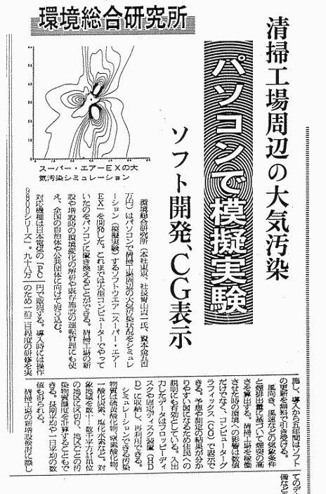 さらにE−NETは東京都渋谷区恵比寿のマンション屋上に設置した市民環境測定局から大気汚染や二酸化炭素、気象データなどを転送し、常時公開する離れ業を可能とした。大気汚染の測定は自治体などでも使っている本格的な測定機器により実施した。 ■日本で最初の政策、条例づくりを支援 ERIは、国や自治体の環境政策や環境関連制度の立案支援、たとえば川崎市環境基本条例と環境基本計画の制定など、日本で最初の政策、施策、制度づくりを多数支援してきた。 最近までは、青山はほとんどボランティアで長野県の廃棄物、土地利用、まちづくり、環境アセスメント、地球温暖化防止などの条例制定や政策を支援してきた。池田も長野県の環境審議会、総合計画審議会の委員として政策を支援している。 2006年8月、滋賀県知事になった嘉田由紀子さんは、大西、青山、池田の昔からの環境研究の仲間である。 ※ERIが支援した環境政策リスト ※ERIが支援した環境計画リスト ![]() 長野県議会主催の政策条例研修会で話す青山貞一長野県環境保全研究所長 ■技術力で価格破壊 さらにERIは高度で複雑な環境シミュレーション技術を生かした研究、業務を得意としている。 従来、大型コンピュータでしかできないとされてきた巨大な環境シミュレーションやデータベースの構築を卓上やノートのパソコン上で行うことに青山、大西、鷹取が日夜意を注いできた。 その結果、20年前までは数億円規模のスパコンでしかできなかった3次元流体計算を10万円そこそこのパソコンで可能としてしまった。 これは学術分野で「価格破壊」を起こしたことを意味する。 その技術を計算サービスとして住民団体に提供する。とともに、自主研究にも援用している。 政府機関が数年の歳月と数千万円かけ行っているこの分野の高度な調査を時間、費用それぞれ1/5〜1/10で行える体制をつくってしまった。もちろん、これでも損はしていない。 逆説すれば、日本のコンサルタントが以下に暴利をむさぼっているか、談合が横行しているかの証左でもある。 ![]() 「パソコンに残業をさせる」創立間もないころの環境総研紹介記事 (日経産業新聞1987年6月26日) ![]() 最初に開発した大気汚染シミュレーションソフト(日経産業新聞) ![]() ![]() 高速パソコンによる3次元流体モデルによる 超高度な3次元大気拡散シミュレーション(自動車排ガス)