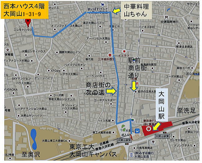東急目黒線(都営地下鉄三田線、東京メトロ南北線)の大岡山(おおおかやま)駅下車、東工大正門を背に商店街の隣の道を北に向かい中華料理山ちゃんがある交差点で左折します。