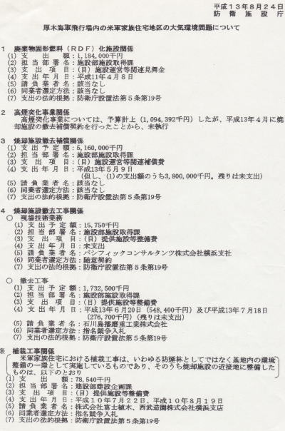 日本政府の厚木米海軍基地に隣接する産廃焼却炉関連調査及び撤収等に用いた予算・経費の情報開示