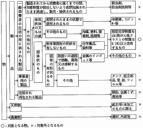 なおここでいう化学物質とは、元素及び化合物(それぞれ放射性物質を除く)となっている(法第2条第1項)。