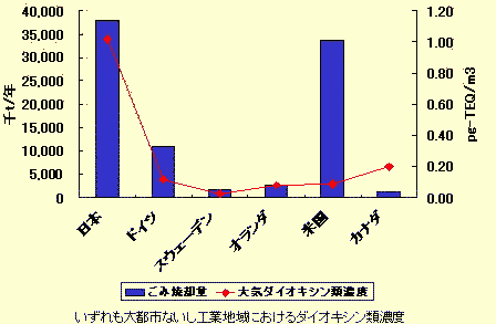 日本は大量廃棄だけでなく、主要先進国がゴミの減量化と非焼却に努力してきたにもかかわらず、「焼却主義」をとってきた。その結果、日本は人口が約2倍の米国よりもゴミ焼却の総量が多い世界最大の大量焼却国となった。図3−4はそれを示すとともに、日本の大気中のダイオキシンの平均濃度が、欧米先進国の約10倍、スウェーデンに較べ約50倍と高くなっていることを示している。