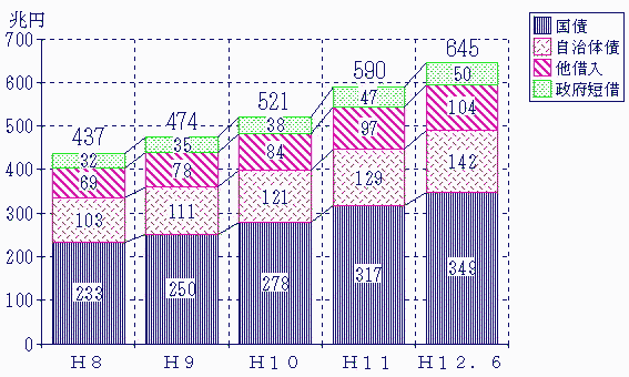 突出した公共事業費の多くを財政面で支えてきたのは国債、地方債などの起債である。わが国がかかえる多重累積債務は平成12年時点で645兆円、平成13年で666兆円に増えている。平成8年以降急激に国債発行が増え、平成11年から平成12年の合計で124兆円と大幅増となっている。平成12年度の日本の国家予算が85兆円、平成11年度が82兆円であるから、いかにこの借金の額が大きいかが分かる。当然、国や自治体の借金は信用があって可能となる。実際、都道府県が発行する債券は、財政健全度合を国が評価し許可している。一方、国については外国がその信用度を格付けしている。信用が低下すれば国債の受け手が減る。金利が上昇し、累積債務がさらに増える。さらにこれらの膨大な累積債務を今後どうやって返済するかが課題となる。債務償還は今の若年層によって行なわれることにならざるをえない。問題は、彼らが公共事業投資のために累積債務を増やしてきた政府や政権の政策形成、意思決定に参加していないことである。