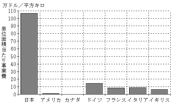 日本には土建業が約60万社あり、600万を超える就業人口があると推定されている。これらはいかに日本が土建系の公共事業費に支えられた異常な国家であるかを示している。OECDのナショナルアカウント(*1)によれば、日本は公共事業費の絶対額が大きいだけでなく、GDP比、国土面積比ともに著しく大きい。G7諸国のGDP比はせいぜい2〜3%だが日本は9%弱である。面積比は米国の78倍、カナダの755倍、ドイツの7倍、フランス、イタリアの12倍、英国の16倍と突出している。