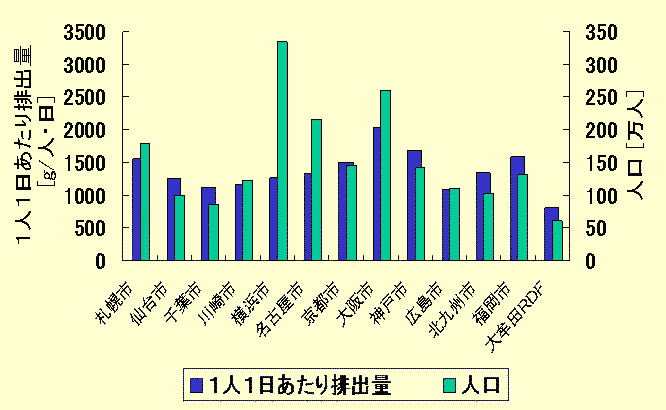 図3−3は、政令指定都市の一人1日排出するゴミ量と自治体全体の総排出量を示している。いずれの政令市も1日一人当たり1〜2kgと大きい。これは中小都市の約2倍となっている。