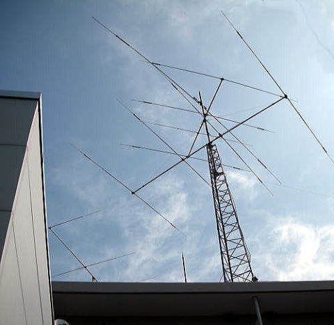 下の写真はマンション屋上に設置した各種アンテナです。メインタワーには14−21MHz用4エレメント八木アンテナ、18−24MHzの3−4エレメント八木アンテナ、7−10MHzのダイポール、左下に見えるのが28MHzの5エレ八木アンテナです。その他、3.5−3.8MHzはスローパーアンテナ、1.8−1.9MHzはロングワイヤーを使っています。地上高は最後部で35mあります。