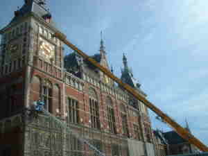 スキポール空港からアムステルダム中央駅には、約15分おきに下の写真(左)の高速鉄道が走っている。20分ちょっとでアムステルダム中央駅に到着。中央駅は工事中だったが、どこか日本の東京駅に似ている(下の写真右)。もちろん、ここでも列車への自転車持ち込みはOKだ。