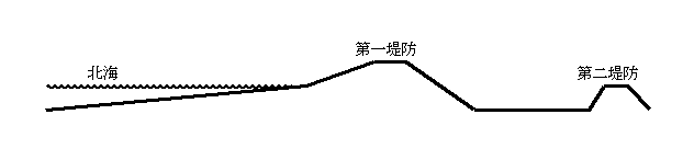 ペッテン村を回ってみて分かったのだが、北海に面する地域には下図のように、まず巨大な第一堤防がある。そして数km先に第二堤防、さらに第三堤防があることが分かった。万一第一堤防を超えて海水が流れた場合、第一堤防と第二堤防の間が遊水池として機能するようになっていた。