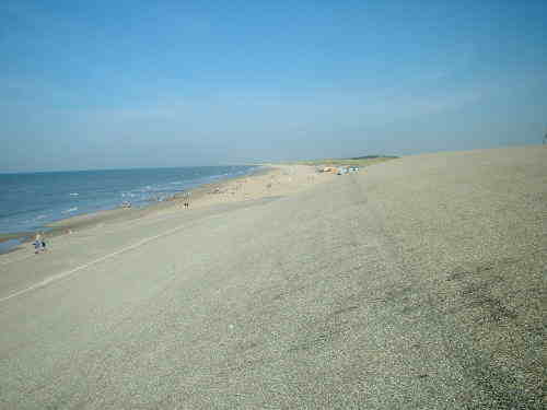 このオランダの巨大堤防は、下の写真にある左下(ペッテン村)から突端のデンホルダーまで何10kmと続く。堤防の上は、自転車や場合によって自動車が自由に走行できるようになっているのも大きな特徴である。