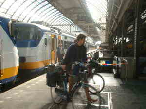 そこでアムス中央駅からアルクマール駅まで写真にある列車で向かう。当然2等で十分だ。写真にあるように、都市間を結ぶ鉄道でも自転車の乗り入れはOKであった。 |
