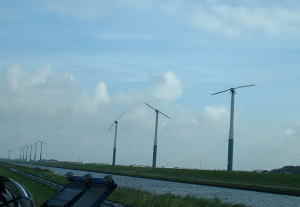 アルクマール駅で下車。路線バスを探し、往復切符を買いペッテン村まで行く。バスは1時間に1本しか走っていない。途中、写真(下)にあるように運河にそってたくさんの風力発電装置が見えた。たまにオランダの伝統的風車もあったが、今は圧倒的に多くがデンマーク産の3枚羽か、2枚羽の風力発電である。実際、ベルリンからオランダに入った段階で、やたら風が強いと感じたが、これは北海に向えば向かうほど風は強く感じるようになった。