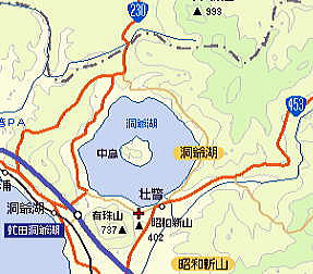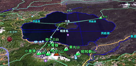 北海道道南地域:中央が洞爺湖。その南に有珠や昭和新山がある