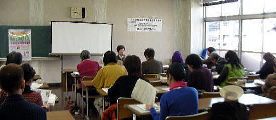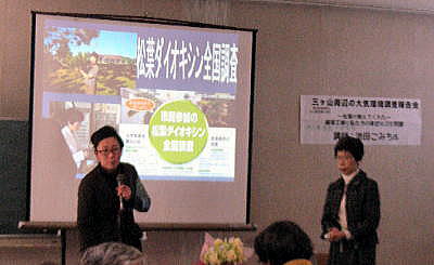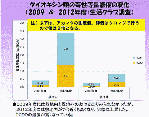■はじめに ![]() 出典:池田こみち講演パワーポイントより 2月の第一日曜日、好天に恵まれた節分の午後、寄居町中央公民館に50名が参加して、市民参加による松葉ダイオキシン調査結果の報告会が開催された。 主催団体である生活クラブ生協熊谷支部の組合員とともに、彩の国資源循環工場の地元である寄居町や小川町の一般市民の方々も参加された。今回の報告会は、今までになく高い濃度が検出されていたことから関心が高かったと思われる。 ![]() 市民参加による松葉ダイオキシン調査結果の報告会 2013.2.3 ![]() 左が主催者の加藤さん、右は池田こみち 報告会では、最初に主催者からこれまでの活動の経過が報告され、その後約1時間半にわたって、筆者より調査結果についての報告を行った。