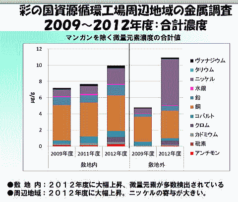 ■環境の悪化が顕著 同施設が本格稼働する前の2004年度から松葉をもちいた市民参加による環境監視活動が始まっており、今回の調査は8年目となる。これまでの調査結果より、各施設における受入廃棄物の量が年々増加していることが分かった。 ![]() 講演する池田こみち 2013.2.3 また、施設ごとに受け入れている廃棄物の中でも廃プラスチックや汚泥などの量が増加していること、一般廃棄物焼却施設からの焼却灰の受入も大きく増加していることなどを背景に、本格稼働前と比べると著しく環境が変化し、ダイオキシン類の濃度が上昇していることが明らかとなった。 また、重金属類も敷地外と比べると高濃度となっている項目が多数見られた。特に松葉に含まれる水銀の濃度は高く、廃プラスチック類や汚泥のサーマルリサイクルや焼却処理、蛍光管リサイクル水銀回収プラントからの影響が危惧された。 敷地内と敷地外周辺地域と比べると敷地内は地形が窪地となっていることや煙突高が低いことなどから汚染が滞留し、環境基準の二倍を超える濃度となっていることが判明した。また、地形が複雑なことも影響し、周辺地域にもその影響が及んでいることも示唆された。 報告の詳細については、報告会の動画を参照していただきたい。 ◆池田こみち:埼玉県環境整備センター関連環境監視調査報告 http://www.ustream.tv/recorded/29001913 また、施設の概要と現状については、以下の動画及び報告を参照されたい。 ◆青山貞一・池田こみち:彩の国・資源循環工場現地視察 You Tube http://www.youtube.com/watch?v=eUb2ClQdUDk ![]() 彩の国 資源循環工場現地視察の動画を上映 ◆青山貞一:松葉ダイオキシン調査で環境基準超過:彩の国資源循環工場 http://www.eritokyo.jp/independent/aoyama-pine12004.html ■質疑応答と情報交換 報告会終了後に40分ほどの質疑応答の時間を設けたが、20名以上が参加し、熱心な質疑と議論が行われた。所沢市から参加された方も加わり、所沢での市民活動についての紹介や情報交流も行われた。 ![]() 市民参加による松葉ダイオキシン調査結果の報告会 2013.2.3 全国でも有数の規模を誇る「彩の国資源循環工場」は秩父の玄関口でもある埼玉県寄居町に立地している。寄居町は埼玉県の北西部、都心から70km圏に位置し、荒川が秩父の山間から関東平野に流れ出す扇状地に発達した町であり、山地、丘陵、台地、低地と多様な地形に恵まれている。 ちょうど寄居町の中心(寄居駅や町役場)から彩の国資源循環工場までは、直線距離で4kmに満たない。しかし、多くの町民はその存在に気がつかないばかりか、ましてや高濃度の有害物質に汚染されていることなど知るよしもない。施設全体が寄居町と小川町との境に広がる里山に囲まれ外からはまったくプラントや煙突も見えないからである。 ![]() 熱心に質疑に聞き入る参加者 しかし、埋立容量 184万立米、民間企業8社による廃棄物のリサイクル及び中間処理の受入可能量は約2000トン/日に及ぶことから、埼玉県内ばかりではなく、東京都や周辺地域からも頻繁に大型トラックが出入りし、周辺道路ではかなり大型車の混入率が高くなっている。県外からの受入量が概ね50%にも達している。 そればかりか、隣接する敷地に第二期工事が既に着工しておりさらに廃棄物処理施設が拡大することとなっている。 この地に廃棄物処理施設が集中したのは昭和48年埼玉県廃棄物処理基本計画で最終処分場の確保を決定し、同50年年10月に寄居町に用地を選定したことに端を発している。 彩の国資源循環工場はPFIの手法を活用し平成17年に竣工、翌平成18年度に本格稼働となっている。それから6年が経過し、施設内の焼却系廃棄物中間処理処理施設三社の受入廃棄物量は順調に増加している。 事業実施前に行われた埼玉県環境影響評価条例に基づくアセスメントでは特に環境影響が指摘されることはなかったようだが、実際、本格稼動から6年が経過した現在、廃棄物の最終処分場と中間処理施設の焼却処理施設や水銀回収施設などから排出される有害化学物質は累積的な影響を及ぼし始めている。 周辺には住宅や農地、歴史的遺産を含む公園なども多いことから、こうした大規模廃棄物処理施設からの累積的影響についてどのように監視し規制していくことが可能なのか、埼玉県の真摯な対応が望まれる。一度こうした施設が作られてしまうと膨張の一途をたどり、周辺住民の不安や危惧はかき消されたまま放置されているのが実態である。 市民参加による科学的な調査によって明らかになったことをどこまで事業者や埼玉県が受け止めることができるのかにかかっている。 ※ 本報告内容は、2012年度の環境行政改革フォーラム論文集に投稿予定 |