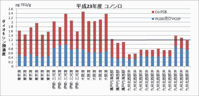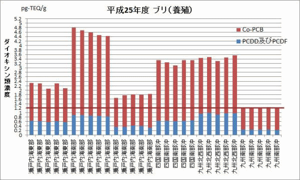 註:以下にあるERIは株式会社環境総合研究所(東京都目黒区)を指す。 【結果の概要】 ここでは、最新のデータをもとに日頃口にしている魚介類のダイオキシン類濃度について概観してみたい。 まず、平成25年度に測定された4種各30匹合計120匹のデータを以下に示す。 ![]() 図1−タチウオ 出典:水産庁報道発表資料よりERI作成 ![]() 図2−ホッケ 出典:水産庁報道発表資料よりERI作成 ![]() 図3−ブリ(天然) 出典:水産庁報道発表資料よりERI作成 ![]() 図4−ブリ(養殖) 出典:水産庁報道発表資料よりERI作成 上記の概要は以下の表の通りである。 ![]() 図5−結果概要表 出典:水産庁報道発表資料より抜粋 ![]() 図6−海域区分図 出典:水産庁報道発表資料より抜粋 上記より明らかになったことは; @タチウオは、大阪湾のものが極端に高濃度となっていること、 Aホッケは北陸沖が高いこと、 Bブリはタチウオやホッケに比べて脂肪分が高いこともあり、全体的に濃度が 高いが、天然ブリでは、地域にばらつきがある中でも山陰沖がやや高く、 養殖ブリでは、はっきりと海域によって濃度が分かれたことである。すなわち、 調査対象となった海域の中で、瀬戸内海南部、四国南部、九州北西部が 他の海域に比べて高いことである。 養殖ブリが海域によって大きく差が出た背景には、飼料の成分、すなわち、鰯などの生餌の捕獲場所、魚粉等の配合飼料の成分等による差が大きいと考えられる。 【結果の評価】 平成25年度の4種120匹の調査結果について、米国環境保護庁(EPA)が定めている ダイオキシン類についての魚類摂取制限指針(下図参照)に照らしてみる。 再度、先に示した図1〜4を見て頂きたい。図中1.2pg-TEQ/gで太線を引いているように、同指針では、1.2pg-TEQ/gを超えた魚は1ヶ月に1度も食べてはいけないとしている。ちなみにEPAの指針はダイオキシン類以外の有害物質についても、摂取制限指針を示している。 ![]() 図7−米国環境保護庁(EPA)の魚類摂取指針 出典:Guidance for Assessing Chemical Contaminant Data for Use in Fish Advisories Volume 2 Risk Assessment and Fish Consumption Limits Third Edition PP.145 そうしてみると、大阪湾のタチウオ、北陸沖や北海道沖日本海側のホッケは1.2pg-TEQ/gを超過している。ブリに至っては天然は全滅、養殖も九州南部沖が1.2pg-TEQ/gでそれ以外はすべて超過している有様で、妊産婦や乳幼児が高頻度に食べることは好ましくないと言える。 水産庁のこの種の調査が本格的に始まったのは平成10年以降のことであるが、対象魚種や対象海域、調査個体数も毎年変わるため、継続的にデータをフォローできない点が問題となっている。 平成11年当時、高濃度であることが分かったコノシロ、スズキなどについてみると、以下の通りである。 ![]() 図8−平成23年度 コノシロ 出典:水産庁報道発表資料よりERI作成 ![]() 図9−平成24年度 スズキ 出典:水産庁報道発表資料よりERI作成 コノシロは、東京湾、伊勢・三河湾、大阪湾が高いが、大阪湾が中でも高濃度となっている。一方、スズキは東京湾、大阪湾が高く、ここでも大阪湾の汚染が際立っていることが分かる。 【所見】 これらのことから、大阪湾の魚介類は総じて高いことを知識として知っておくことが大切であるとともに、ブリなどの油脂類の多い大型魚については、総じてダイオキシン類の濃度が高いことから、産地に気をつけたり、乳幼児には与えないような注意も必要であろう。 こうした情報は、食の安全性の観点から分かりやすく解説されて提供されるべきであるが、行政は年度末にこっそり公表しているだけで多くの人が気がつかない。メディアも報じない。 繰り返し指摘しているが、日本でこそ、魚介類のダイオキシン類摂取の指針を早急に制定する必要がある。放射性物質による魚介類の汚染への関心が高まっているが、同時にダイオキシン類や重金属類も発がん性物質であり、消費者として関心をもって見る必要がある。 |
